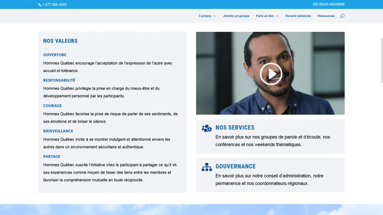 Refonte express du site Hommes Québec à partir de l’installation WordPress existante et avec l’outil de mise en page Divi déjà utilisé par le client. Réorganisation de l’arborescence et des contenus existants et publication de nouvelles actualités. Révision et correction de textes, et disposition de ces textes en blocs plus lisibles et empilables sur appareils mobiles. Ajout de sous-titres et suggestion de requêtes cibles afin de mieux positionner le site dans les moteurs de recherche.
