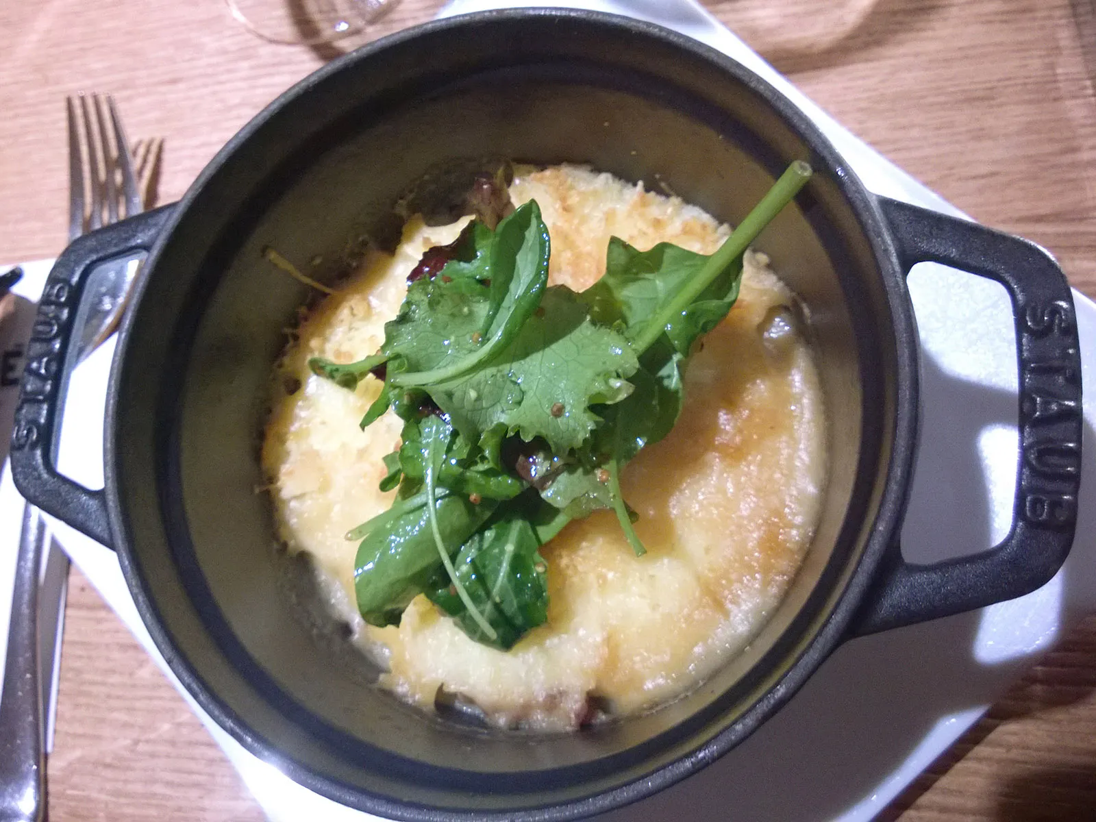 Variante française de notre pâté chinois, le parmentier est le comfort food par excellence et c’est d’autant plus vrai lorsque celui-ci est fait à base de bœuf Angus, servi dans une petite casserole bien chaude, et rehaussé d’un gratin léger et croustillant. Chaque plat d’accompagnement était en lui-même une expérience. J’ai craqué pour le courgettes marinées sautées à l’anis et à la verveine, le chou-fleur bohémienne noisettes et sauce vierge, ainsi que la miche de pain de campagne servie avec du beurre au café. La Pavlova aux abricots de la vallée du Rhône, de facture classique, est tout de même l’un des meilleurs desserts que j’ai mangés lors de ce séjour. Une raison de plus de sortir du TGV pour découvrir la jolie ville de Valence.