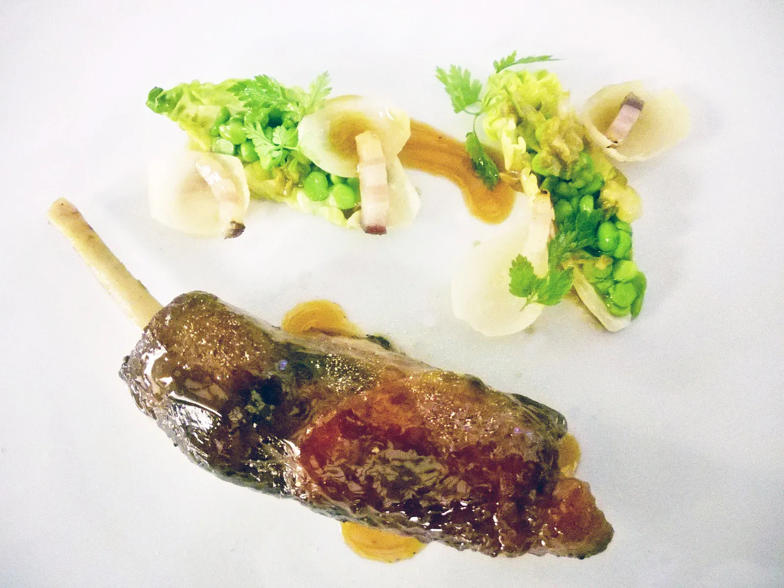 Si le canard est omniprésent dans le Sud-Ouest, la pintade semble être sur tous les menus en Auvergne-Rhône-Alpes. Ce volatile donne une viande foncée et bien juteuse, qui nous a été servie confite dans un jus à l’infusion de réglisse, avec petits pois et endives à la française en guise d’accompagnement. Un repas à la fois consistant et léger, servi sans fla-fla. Une création de Julien Allano.
